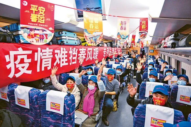 今年,要繼續做好“六穩”、“六保”工作特別是保就業保民生保市場主體。圖為2022年2月8日,務工人員乘坐D1869次列車從貴州省遵義市前往廣東省返崗務工。該列車是貴州省今年開行的首趟返崗務工動車專列。 新華社發 包亮/攝