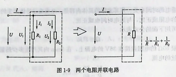 如果電路中有兩個或更多個電阻連接在兩個公共的節(jié)點(diǎn)之間,則這樣的連接方式就稱為電阻的并聯(lián)。各個并聯(lián)中的電阻上承受著同一電壓。圖 1-9 是兩個電阻并聯(lián)的電路。