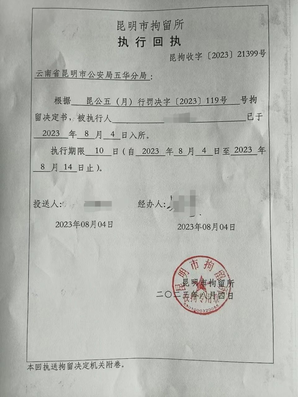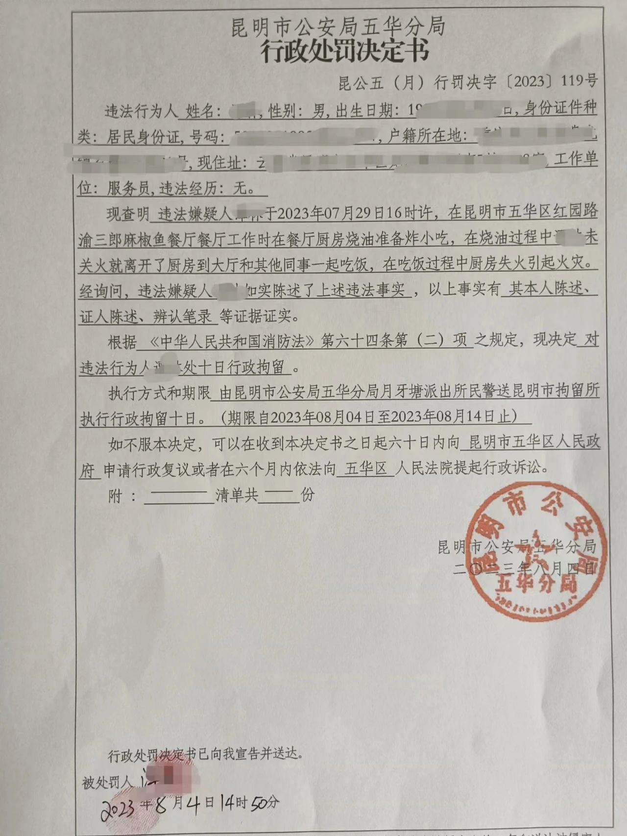 近日,五華區消防救援大隊聯合月牙塘派出所對1名過失引起火災的人員依法進行了行政拘留。
